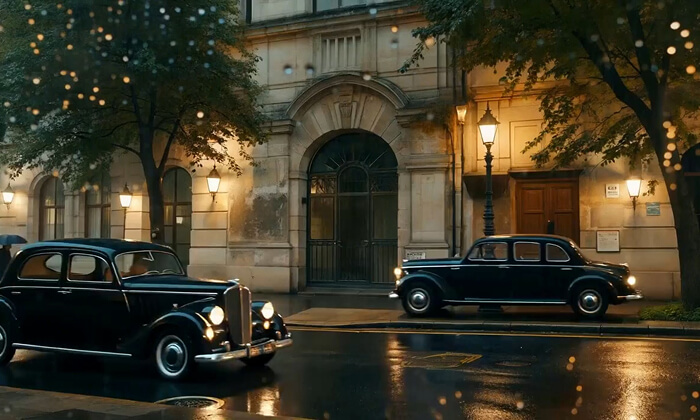 Prompt: A lone detective walks into a rain-soaked alley at night, neon signs reflecting on wet pavement, suspenseful atmosphere.