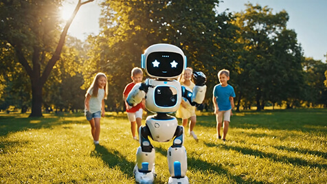 Prompt: A cute robot dancing in a sunny park, children playing around, cheerful background music.