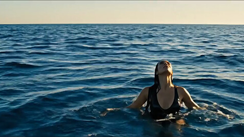 Prompt: Whales leap out of the water, splashing water everywhere, while a person floats gently, and the light and shadows move naturally underwater.