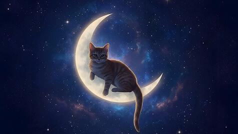 Prompt: Generate a video from the image of a kitten sitting on a crescent moon, with its tail wagging, eyes blinking, the moon slowly rotating, and stars twinkling in the night sky.